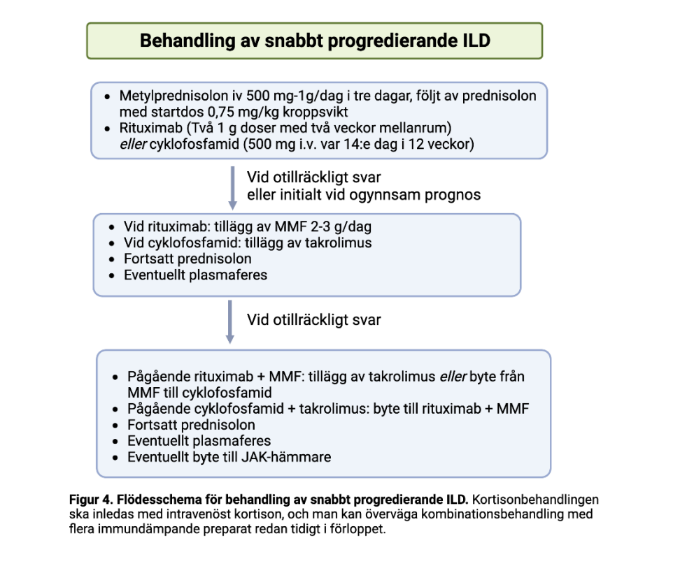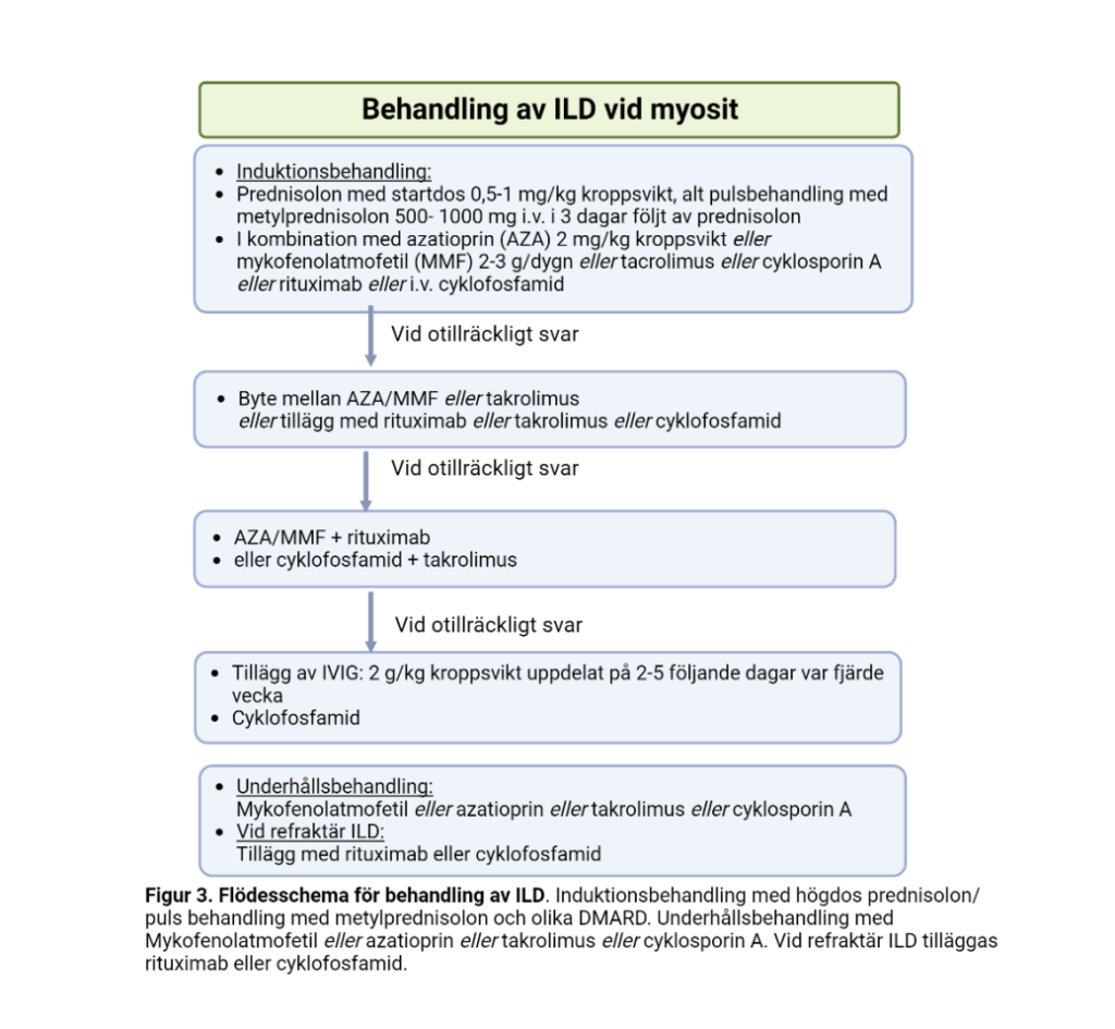 Det finns mycket få kontrollerade studier avseende behandling av ILD vid myosit, utan de publikationer som finns är i stor utsträckning fallrapporter och fallserier. Detta gör att rekommendationer om behandling är baserade på ett magert vetenskapligt underlag, men de sammanfattar ändå den kunskap som är tillgänglig. Under 2025 har guidelines för handläggning av ILD vid systemsjukdomar, inkluderande myosit, publicerats (24). Det är också värt att ha i åtanke att ILD vid myosit inte är någon enhetlig sjukdom, utan utgörs av olika lungmanifestationer med varierande grad av kliniska symtom, från asymptomatisk till snabbt progredierande och med olika grad av inflammation och fibros, vilket medför att de observationer som rekommendationerna baseras på är heterogena. Det finns dock övertygande stöd för att immunmodulerande behandling är till gagn för patienter med myositassocierad ILD, både i termer av minskad lungsjukdom, förbättrad lungfunktion men också genom minskat kortisonbehov. Viktigt är att dessa patienter handläggs i samråd med lungläkare och gärna också med radiolog med speciell expertis inom lungsjukdomar. Diskussion inom interdisciplinära ronder rekommenderas särskilt vid komplicerade fall. Utvärdering av behandlingseffekt bör göras avseende klinik men också med lungfunktionstest mätt med FVC och DLCO efter 6 veckor och 3 månader, eller oftare efter individuell bedömning. Vid progress under pågående behandling bör ny HRCT övervägas för att bedöma orsak till försämringen.