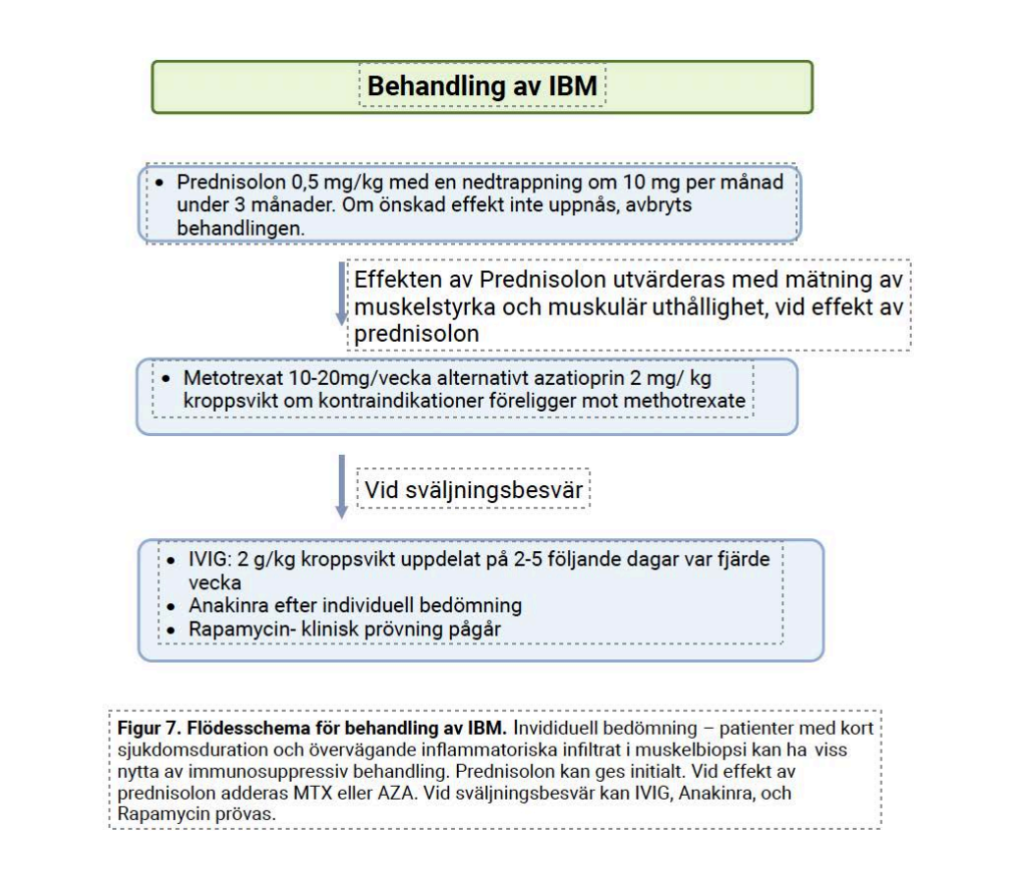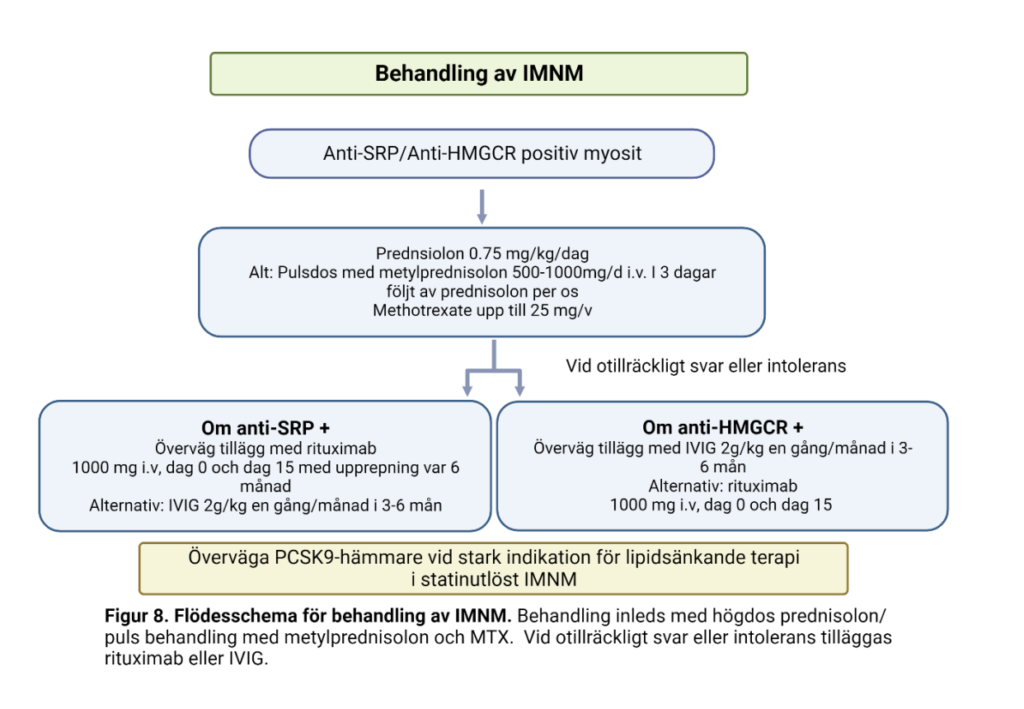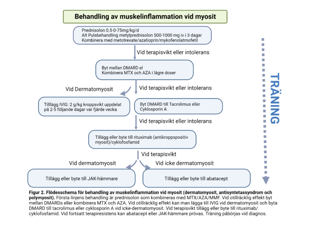 De flesta rekommendationer för behandling av muskelinflammationen vid myosit föreslår att immundämpande behandling påbörjas så snart som möjligt efter att diagnos myosit har fastställts. Här är subgruppen inklusionskroppsmyosit (IBM) ett undantag, se separat text om IBM. Basen i farmakologisk behandling av myosit utgörs av induktionsbehandling med glukokortikoider i kombination med ett immundämpande läkemedel (disease modifying anti-rheumatic drug, DMARD) för att minska kortisonbehov och för att optimera den immundämpande effekten. Oftast föreslås metotrexate som förstahandspreparat. Alternativt kan azathioprin eller mykofenolatmofetil användas. I nästa steg kan dessa preparat bytas mot varandra. Som andrahandsval, kan två förstahandsmedel kombineras (metotrexate och azathioprin) eller ersättas med cyklosporin eller takrolimus. I tredje hand föreslås tillägg med rituximab eller cyklofosfamid eller vid subgruppen dermatomyosit: högdos intravenöst immunglobulin där en nyligen publicerad randomiserad, kontrollerad studie visade signifikant effekt med det primära utfallsmåttet ”total improvement score” hos patienter med dermatomyosit (15). Vid fortsatt terapiresistens eller intolerans kan abatacept eller annat preparat som ingår i pågående läkemedelsstudier prövas (Fig 2). För vissa subgrupper finns andra rekommendationer baserade på erfarenhet, v.g. se nedan.