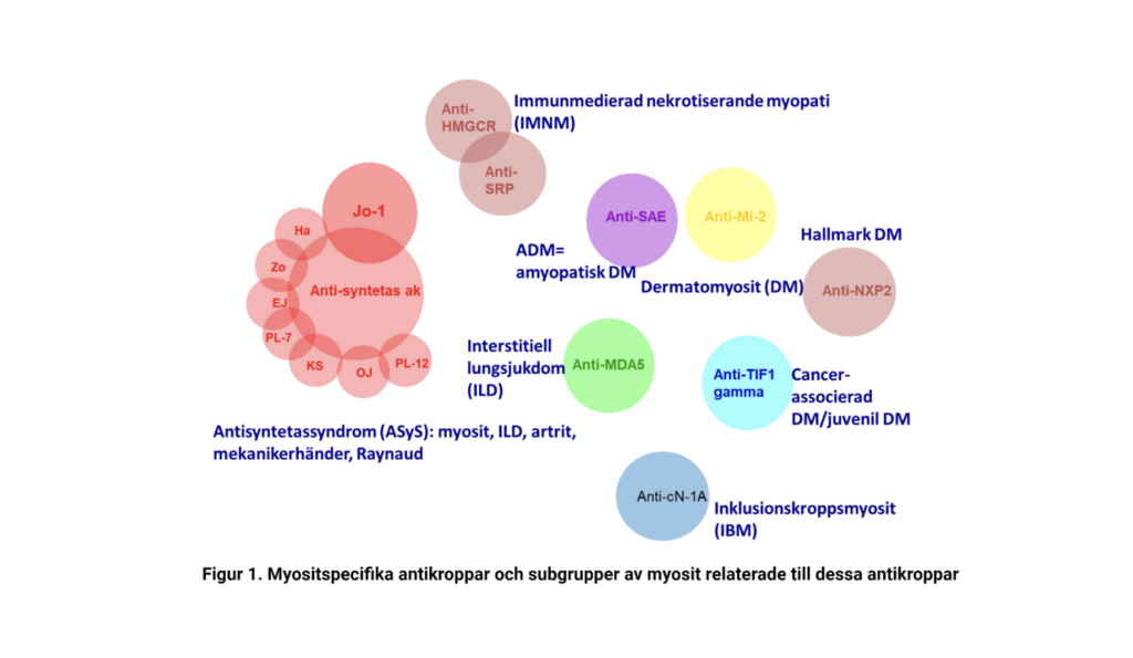 Idiopatisk inflammatorisk myopati (IIM) ofta kallad myosit, är en sällsynt inflammatorisk systemsjukdom med en incidens om ca 11 per miljon personår och en prevalens om ca 14 per 100 000 enligt svenska registerdata. Myosit är ett heterogent sjukdomstillstånd där kardinalsymtomet är muskelsvaghet som ses hos de flesta patienter. Extramuskulära symtom är vanliga och kan ibland dominera sjukdomsbilden, såsom hudutslag, interstitiell lungsjukdom, artrit, Raynauds fenomen och hjärtpåverkan. Sedan 50 år tillbaka har myositsjukdom hos vuxna indelats i dermatomyosit (DM), polymyosit (PM) och inklusionskroppsmyosit (IBM), en indelning baserad på skillnader i kliniska manifestationer och histopatologisk bild i muskelbiopsi. Autoantikroppar är vanligt förekommande vid myosit. Under de senaste decennierna har flera autoantikroppar identifierats som är specifika för myosit och sällan förekommer vid andra sjukdomstillstånd. Dessa autoantikroppar är ett starkt stöd för myositdiagnosen, dessutom är de associerade med specifika konstellationer av organmanifestationer och har gjort det möjligt att indela myosit i mer homogena subgrupper än de tidigare; därför har vi nu subgrupperna dermatomyosit, amyopatisk dermatomyosit, antisyntetassyndrom, immunmedierad nekrotiserande myopati (IMNM), inklusionskroppsmyosit, polymyosit och s.k. overlap myosit (OM) (Figur 1) (1). Med ökad kunskap om patofysiologi vid myosit är det möjligt att ytterligare subgrupper kommer att kunna identifieras.