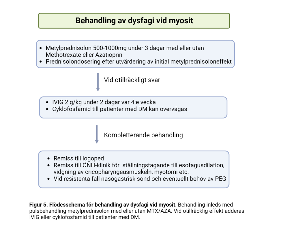 De förslag på behandlingsrekommendationer som vi presenterar här är baserade dels på nyligen publicerade riktlinjer utgivna av British Society for Rheumatology (2), Norsk reumatologisk förenings guidelines, UpToDate och dels från PubMed. Det finns få kontrollerade studier varför rekommendationerna för behandling till stor del grundar sig på öppna studier eller retrospektiva studier och expertutlåtanden. Vidare är de flesta publicerade studier baserade på den äldre subgrupperingen av myosit: polymyosit, dermatomyosit och inklusionskroppsmyosit och än färre studier finns för de nya subgrupperna. Vårt dokument är inriktat på behandling av vuxna individer med myosit. Myosit kan debutera i barnaåren, varav många går i remission, men en del med juvenilt debuterande myosit utvecklar en kronisk form som fortsätter att ge symtom i vuxen ålder, antingen i form av fortsatta skov med aktiv inflammation eller i form av bestående skador t.ex. i form av muskelatrofi. Det finns inga studier att basera förslag till behandling av dessa personer, utan de får behandlas utifrån individuella bedömningar.