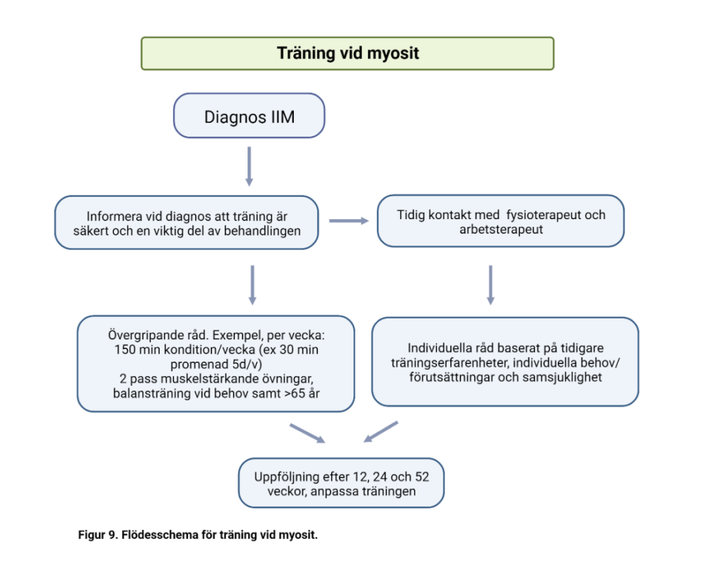 Vi ger först en översikt av farmakologisk behandling av muskelinflammationen vid myosit (baserad på studier med den äldre subgruppsindelningen), därefter följer behandlingsförslag för specifika manifestationer och kliniska subgrupper där det finns någon form av underlag för rekommendationer följt av råd om fysisk träning vid myosit.