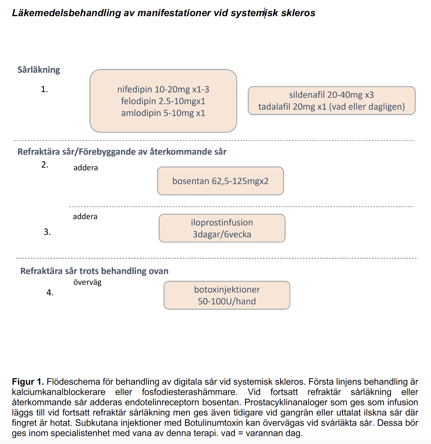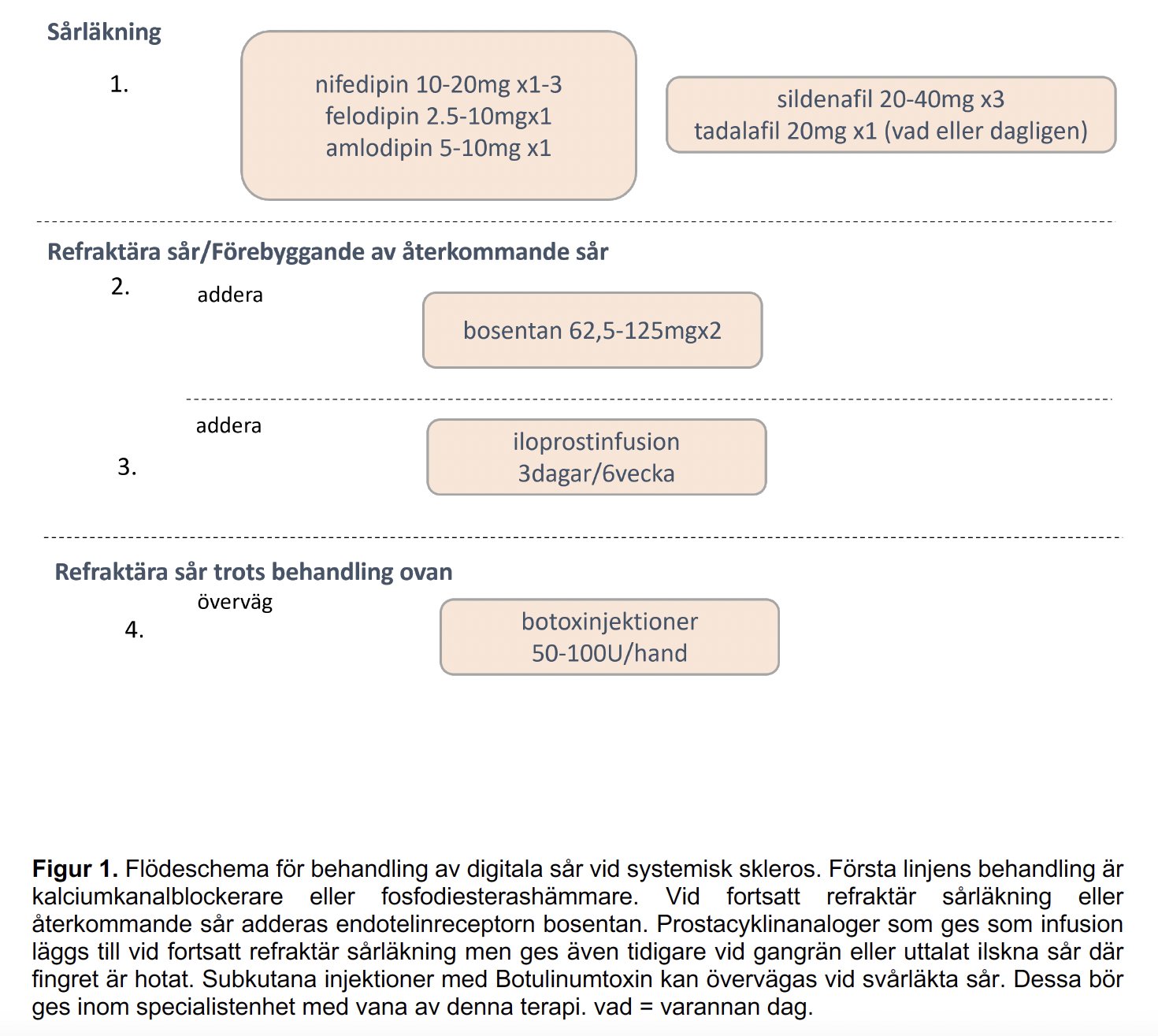 För behandling av digitala sår rekommenderas insättning och/eller optimering av Ca-antagonister, såsom nifedipin, felodin eller amlodipin eller fosfodiesterashämare såsom sildenafil eller tadalafil. Vid otillräcklig effekt eller återkommande sår rekommenderas tillägg av endotelinreceptor antagonisten bosentan. Vid otillräcklig effekt eller biverkningar rekommenderas tillägg av intravenösa prostacyklinanalogen iloprost. Valet att rekommendera bosentan före Ilomedin är baserat på förväntat lägre sjukvårdskostnader för behandling med Bosentan jämfört med Ilomedin [20]. Vid behandlingsresistenta sår kan botulinumtoxin-A injektion övervägas.