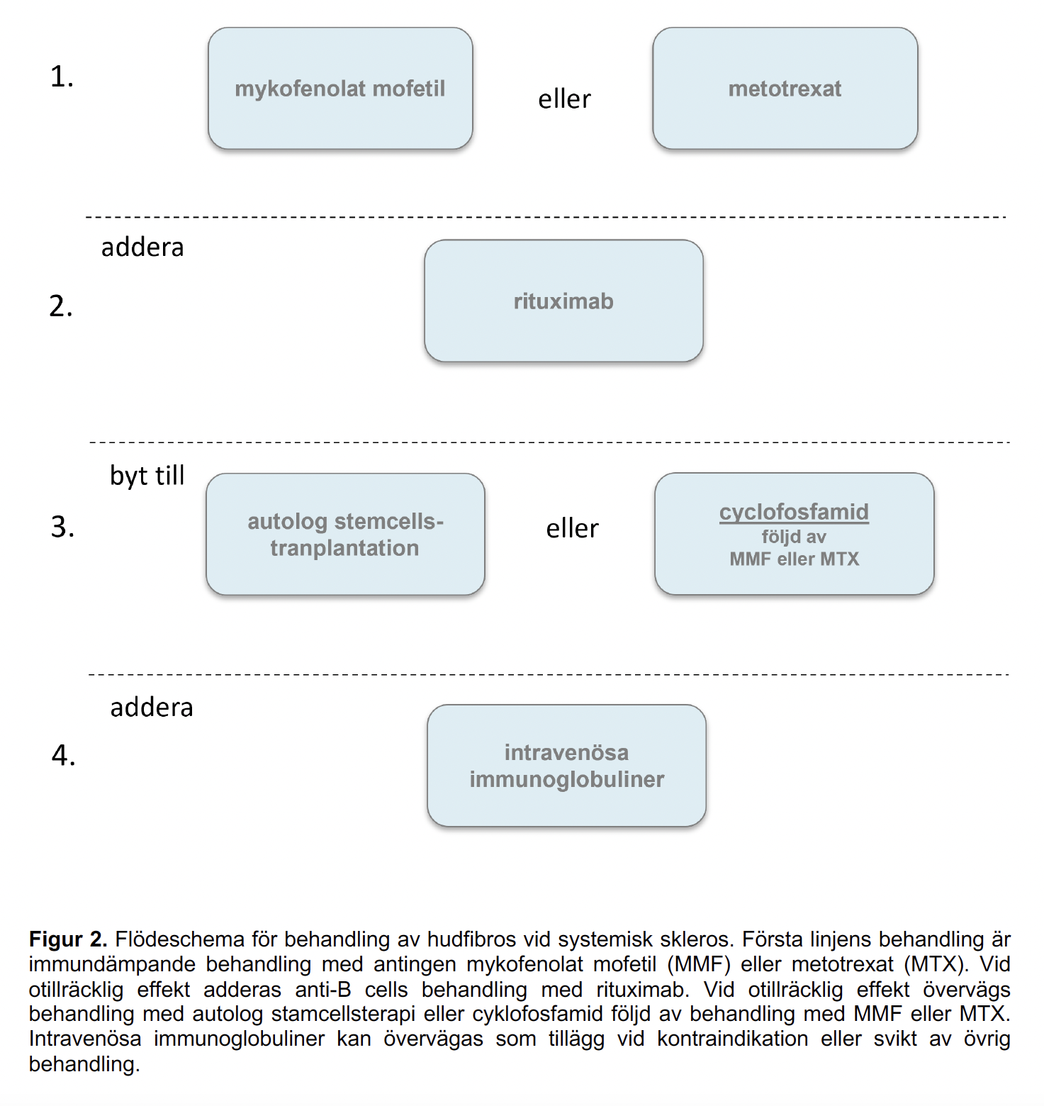 Behandling med rituximab skall övervägas vid progredierande hudfibros. I en RCT har det visats att mRss hos patienter som behandlades med rituximab (två 1g doser med 2 veckors mellanrum) minskade 24 veckor efter interventionen till skillnad från patienter som fick placebo, där mRss ökade [47]. Effekt ses även i förlängningsstudien efter 48 veckor [48]. Skillnaden var signifikant och kliniskt relevant. Denna studie är dock gjord enbart på japansk population, vilket gör att resultat bör tolkas med viss försiktighet. Till stöd för rituximab behandling finns även observationella studier [49, 50] och en multicenter open-label okontrollerad studie [51]
