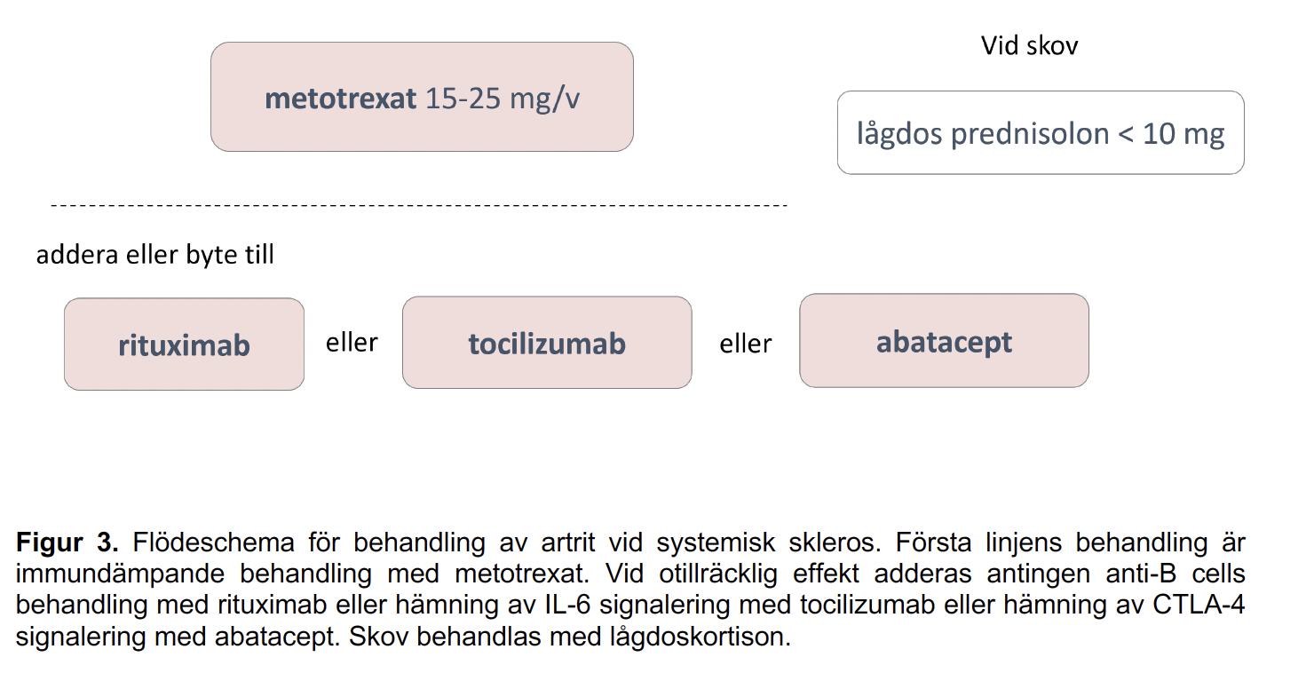 Rekommendationen för behandling av artrit hos patienter med systemisk skleros är i första hand metotrexat(MTX), lågdos prednisolonkan övervägas vid skov. Nästa steg i behandlingstrappan utgörs av rituximab,tocilizumab och abatacept.
