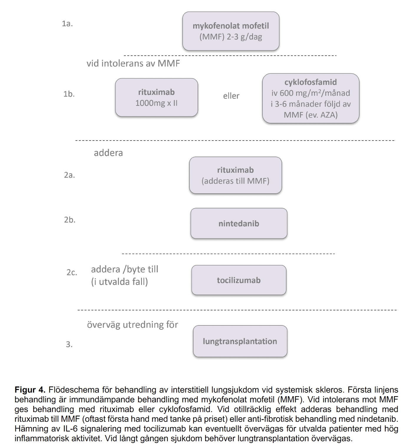I nuläget rekommenderas i första hand behandling med mykofenolat mofetil (MMF). Utifrån alltmer övertygande data gällande rituximabkan även detta övervägas som förstahandsbehandling, vid intolerans mot MMF. Detta stöds av tidigare klinisk erfarenhet, god kännedom om läkemedlet samt den effekt det kan ha även vid andra manifestationer av systemisk skleros. Eventuellt kan initial behandling med cyklofosfamid övervägas i vissa fall tex. när MMF ej tolererats. Detta ska då följas av behandling med, i första hand MMF förutsatt att patienten tolererar detta (3g/dygn, eller högsta tolererade dosen över 1,5g/dygn) och i andra hand azathioprin (2 − 2,5mg/kg/dygn) [70]. Vid användning av cyklofosfamid rekommenderas att ge intravenösa pulsar (600mg/m2 var 4:e vecka).