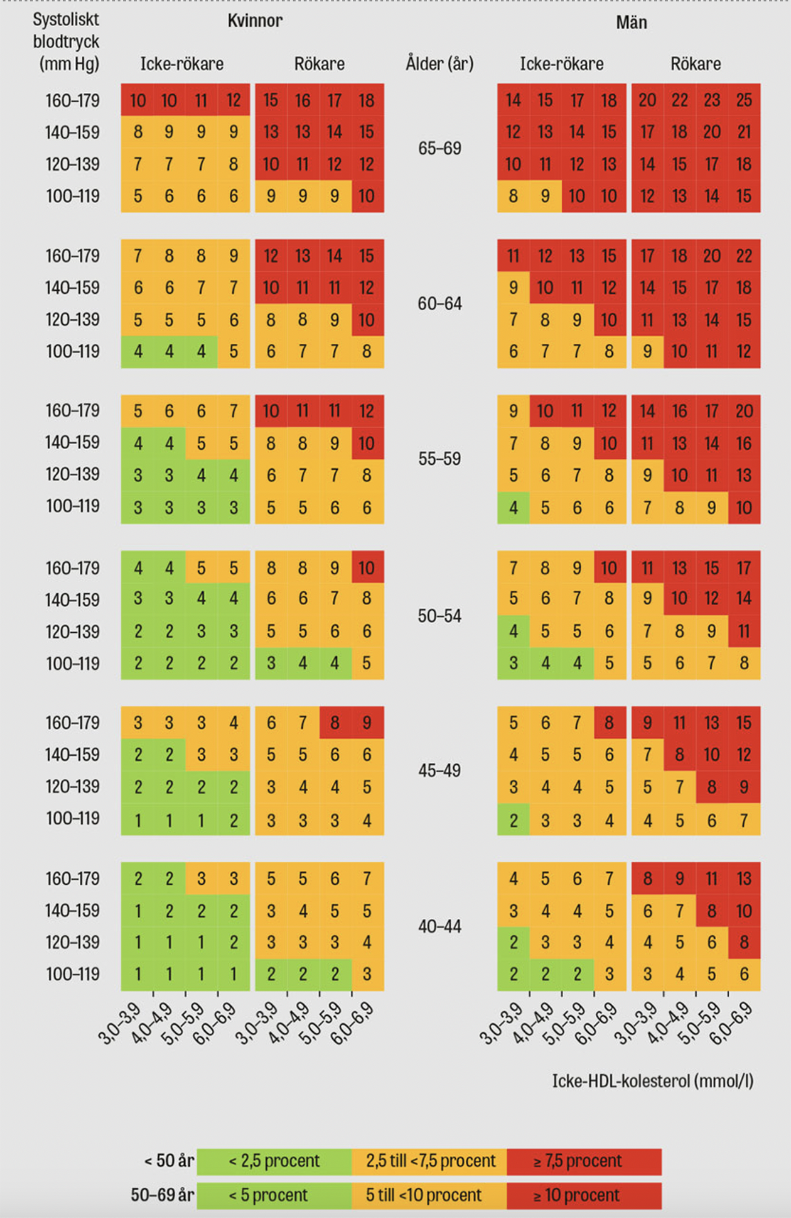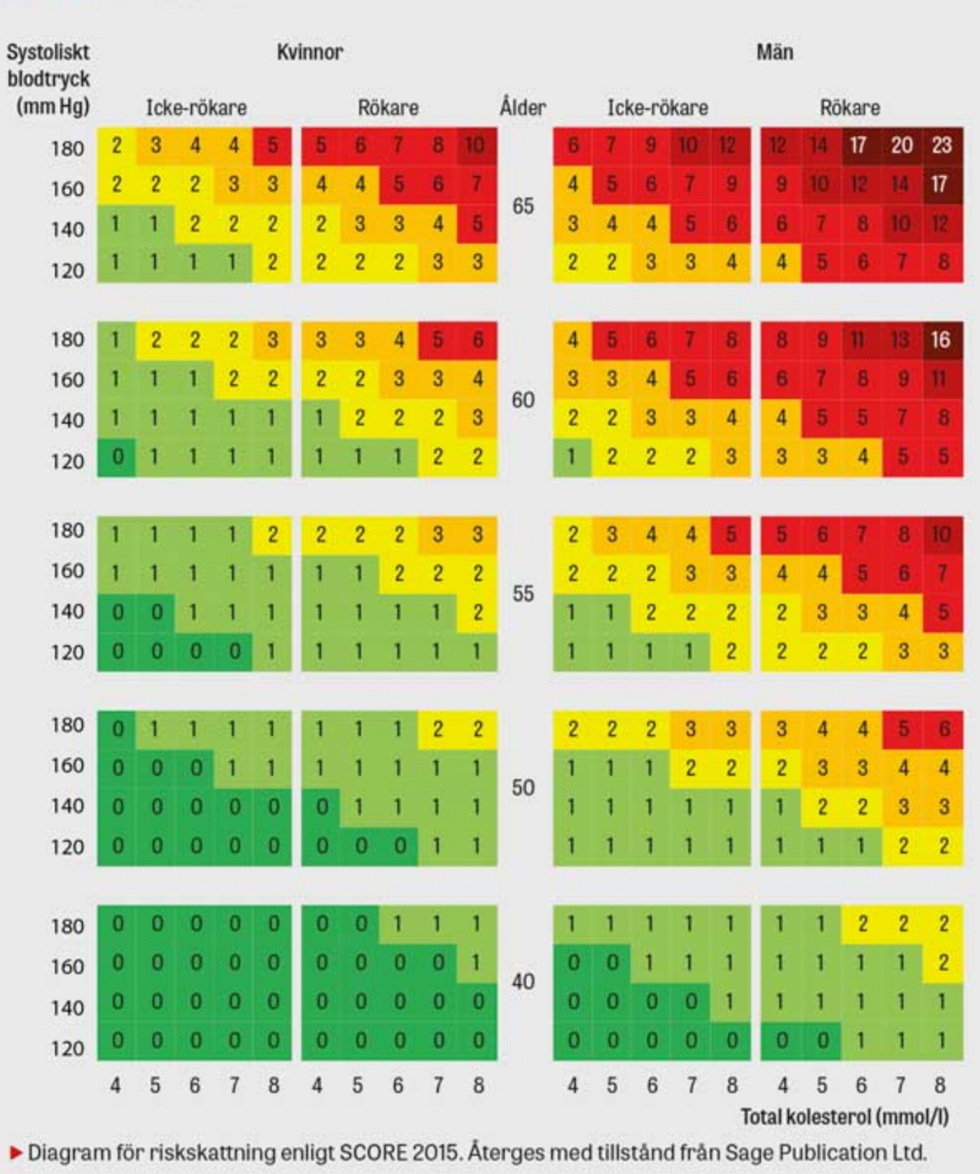SCORE-algoritmen för skattning av risk att dö i kardiovaskulär sjukdom under den närmaste 10-årsperioden. Risken i % fås genom att för en person leta fram kön, ålder och rökkategori i diagrammet; för blodtryck och kolesterol väljs den nivå som ligger närmast personens. Betydelsen av livslång exponering fås genom att följa diagrammet uppåt. För personer under 40 år kan diagrammet beskriva den ökande risken om en viss riskprofil kvarstår i högre ålder.