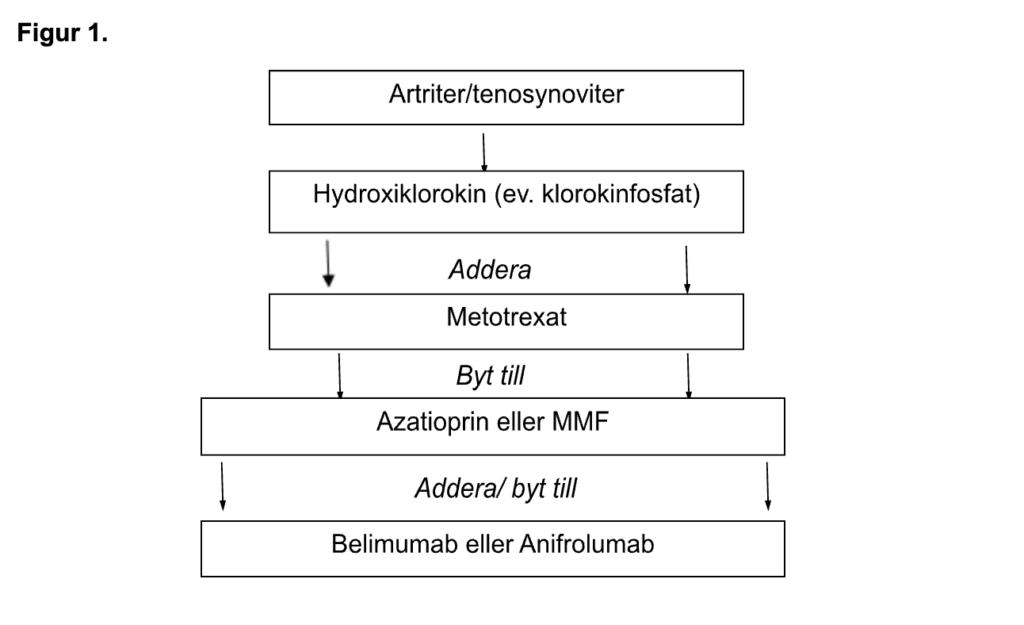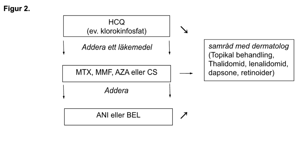 Muskuloskeletala manifestationer kan utgöra målorgan för behandling. En behandlingsalgoritm visas i Figur 1. Behandling med hydroxiklorokin (HCQ) ska alltid ges om inget särskilt skäl talar emot, och behålls då annan behandling adderas. Perorala kortikosteroider eller intra-artikulära injektioner kan ha sin plats som överbryggande behandling. Vid kvarstående artrit är nästa steg tillägg av metotrexat (MTX) (23). Om inte detta har tillräcklig effekt kan istället AZA eller MMF provas. Vid otillräcklig effekt eller biverkningar bör man överväga tillägg av/byte till biologisk behandling i form av belimumab (BEL) eller anifrolumab (ANI). Både BEL och ANI uppvisade effekt vid artrit, och för BEL särskilt i de fall när samtidig serologisk aktivitet (komplementkonsumtion och/eller anti-dsDNA antikroppar) förelåg (24-26). Behandling av SLE-relaterad myosit liknar den som ges vid artrit, dvs. kortikosteroider, MTX, AZA och MMF i första hand. Erfarenheten av biologisk behandling av SLE-myosit är begränsad. Vid generaliserad smärt-och trötthetsproblematik har fysisk aktivitet stor betydelse, se även SRF:s rekommendationer för modern reumarehabilitering (MORR).