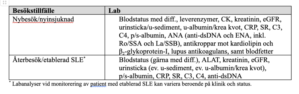 SRFs ger följande generella råd avseende vård och behandling av patienter med SLE. Bästa kliniska omhändertagande av patienter med SLE omfattar en genomgång av sjukdomshistoria inklusive hereditet och riskfaktorer, klinisk undersökning samt labutredning enligt tabell nedan.