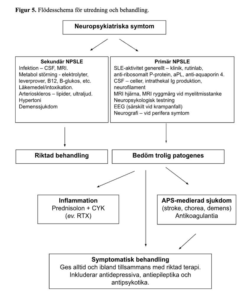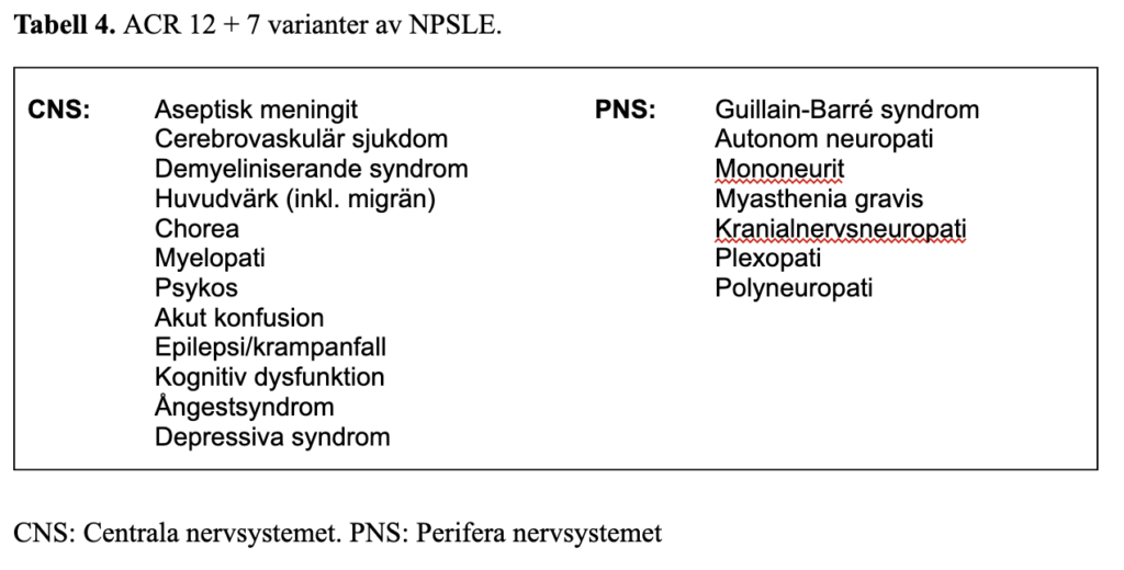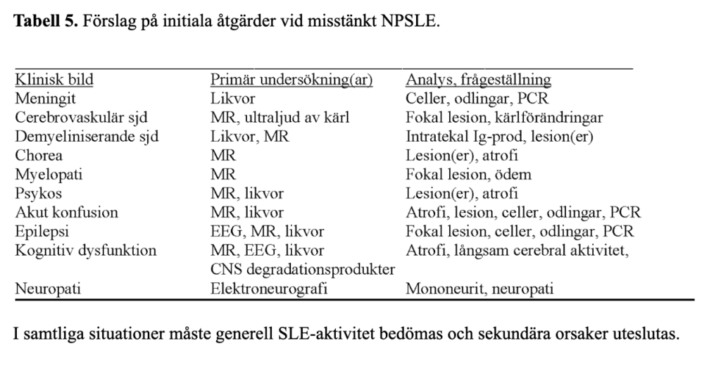 - Symtom från centrala och perifera nervsystemet är vanliga vid SLE, men de är långt ifrån alltid inflammatoriskt betingade. Utredning ska inriktas mot huruvida symptomen är uttryck för grundsjukdomen eller orsakade av andra faktorer såsom infektion, läkemedelsbiverkan, intoxikation, metabol rubbning, hypertoni eller reaktion på svår sjukdom.