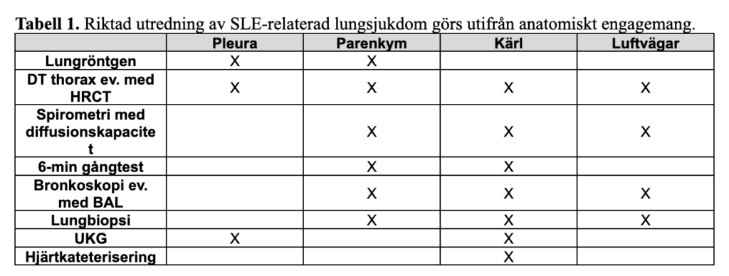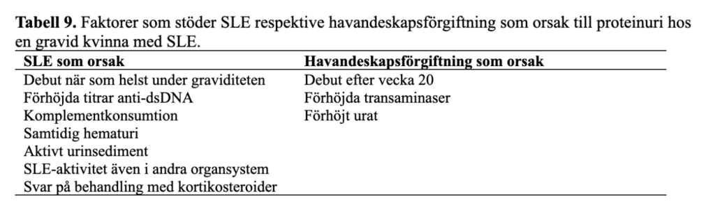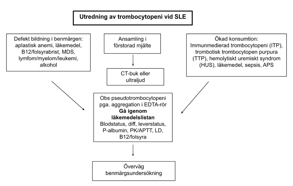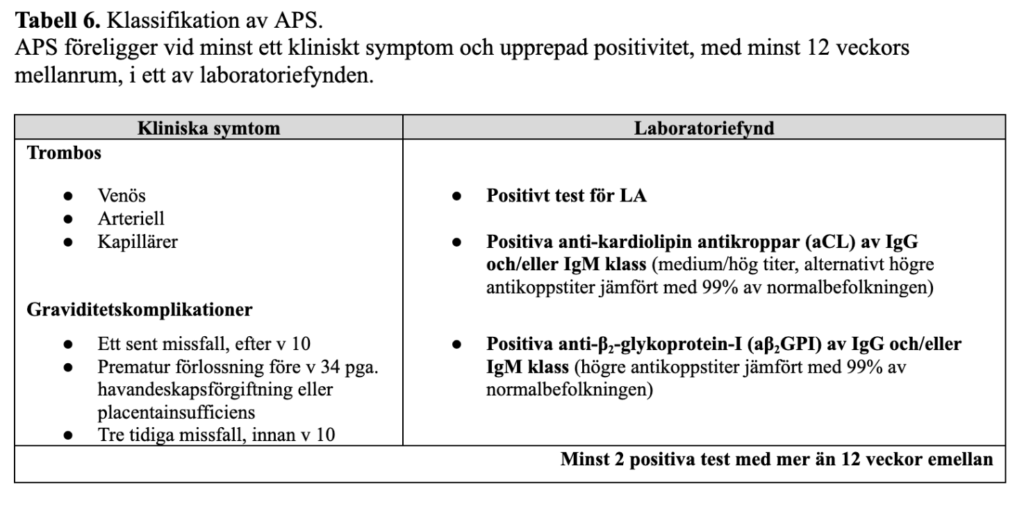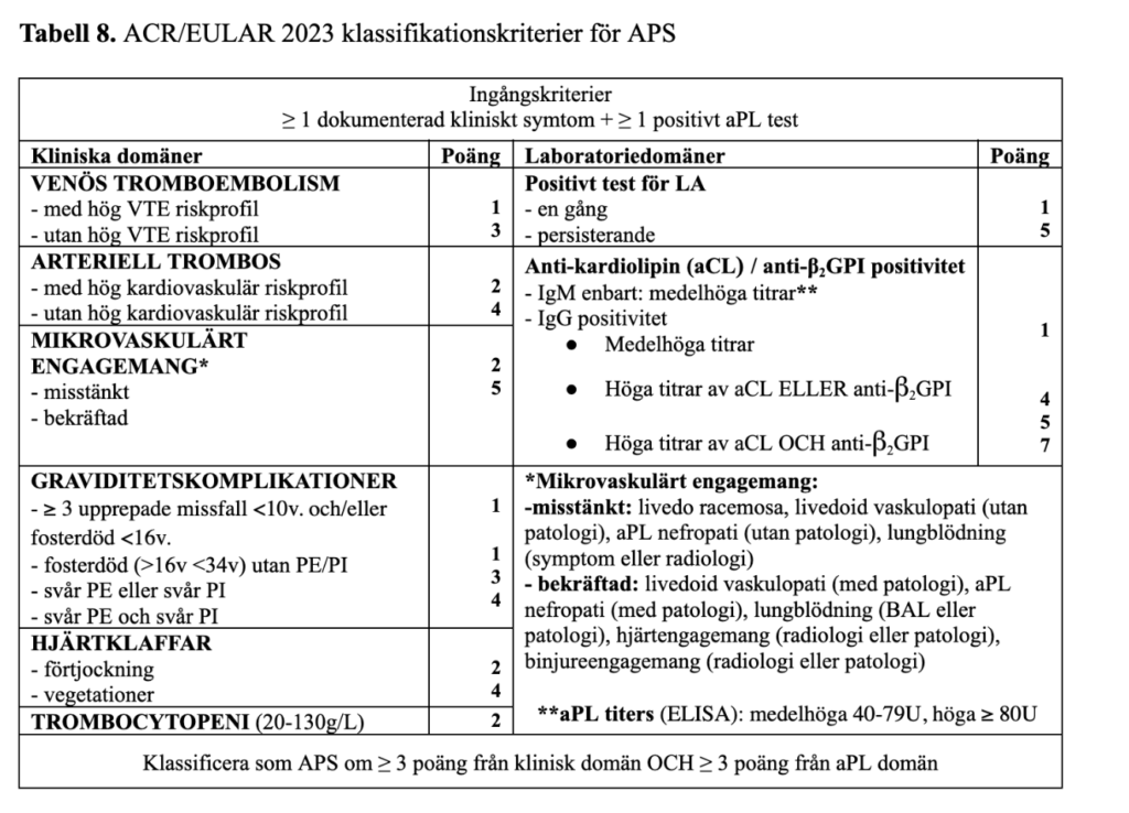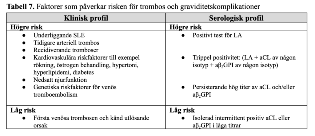 - Antifosfolipidsyndrom (APS) förekommer hos 15–20 % av SLE-patienter och diagnostiseras utifrån kliniska symtom (t.ex. trombos och/eller graviditetskomplikation) samt persisterande förekomst av fosfolipidantikroppar. Kontroll av fosfolipidantikroppar bör ingå i initial utredning av SLE. Waran utgör grunden för behandling av manifest APS.