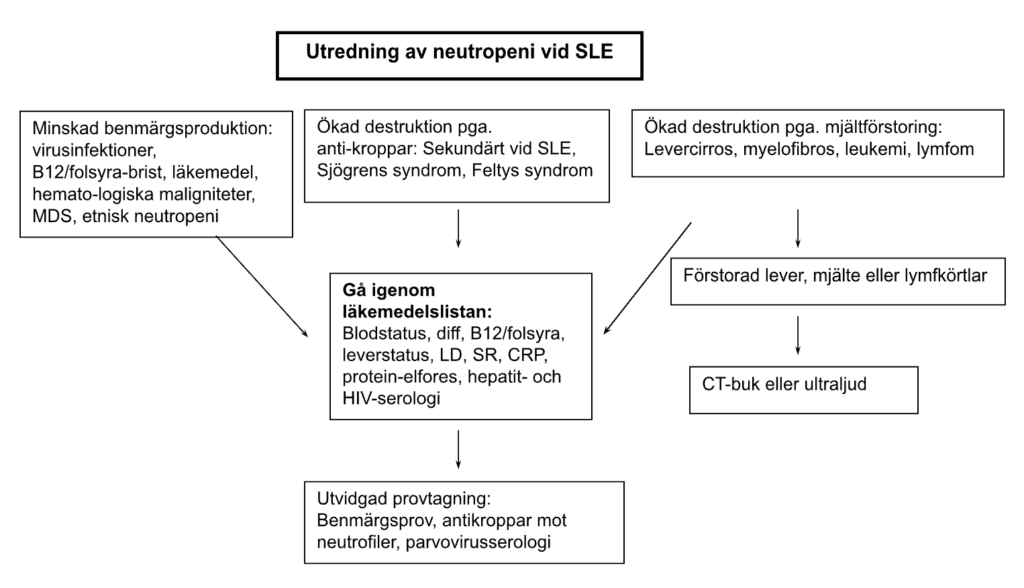 Leukopeni (<3,0×109/L) och neutropeni (<1,5×109/L) kan bero på immunologiska reaktioner, på behandling (till exempel AZA, cyklofosfamid [CYK], rituximab [RTX]), på benmärgsdysfunktion eller på hypersplenism. Lymfocytopeni (<1,0×109/L) kan orsakas av anti-lymfocytantikroppar, ökad apoptos eller behandling med kortikosteroider.