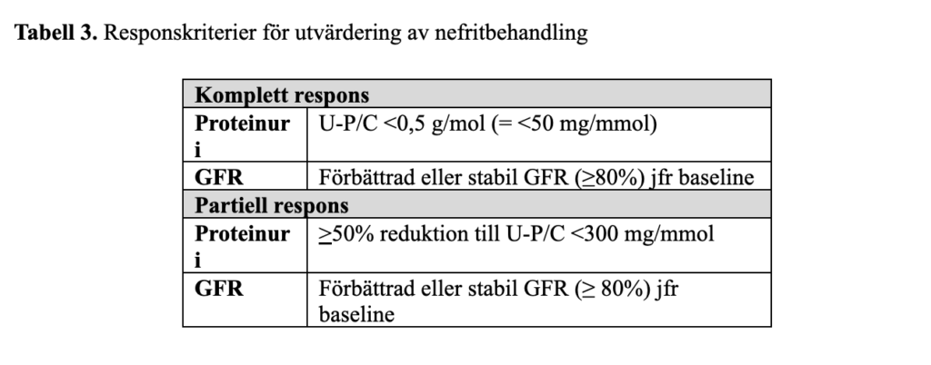 - Oavsett tidigare organengagemang ska kontroll av blodtryck och urinsticka alltid ingå vid återbesök. Nytillkommen albuminuri ska inge misstanke om nefrit och njurbiopsi bör övervägas.
