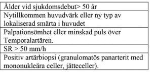 Tabell I. ACRs klassifikationskriterier för jättecellsarterit från 1990