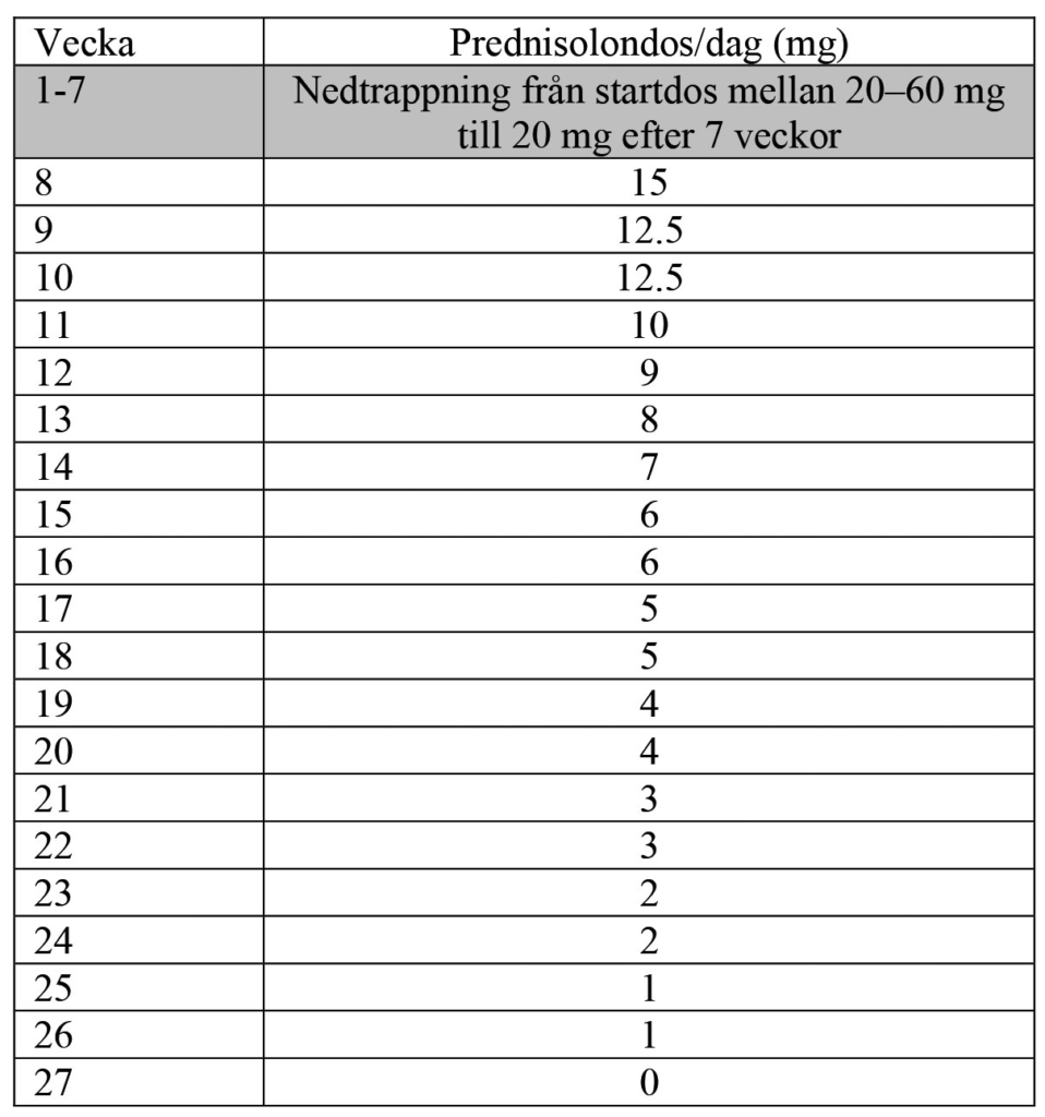 *Initial Prednisolondos enligt beslut av behandlande läkare. Vid nydebuterad GCA rekommenderas en startdos på 40-60 mg/dag. Lägre doser kan vara aktuellt vid recidiv.